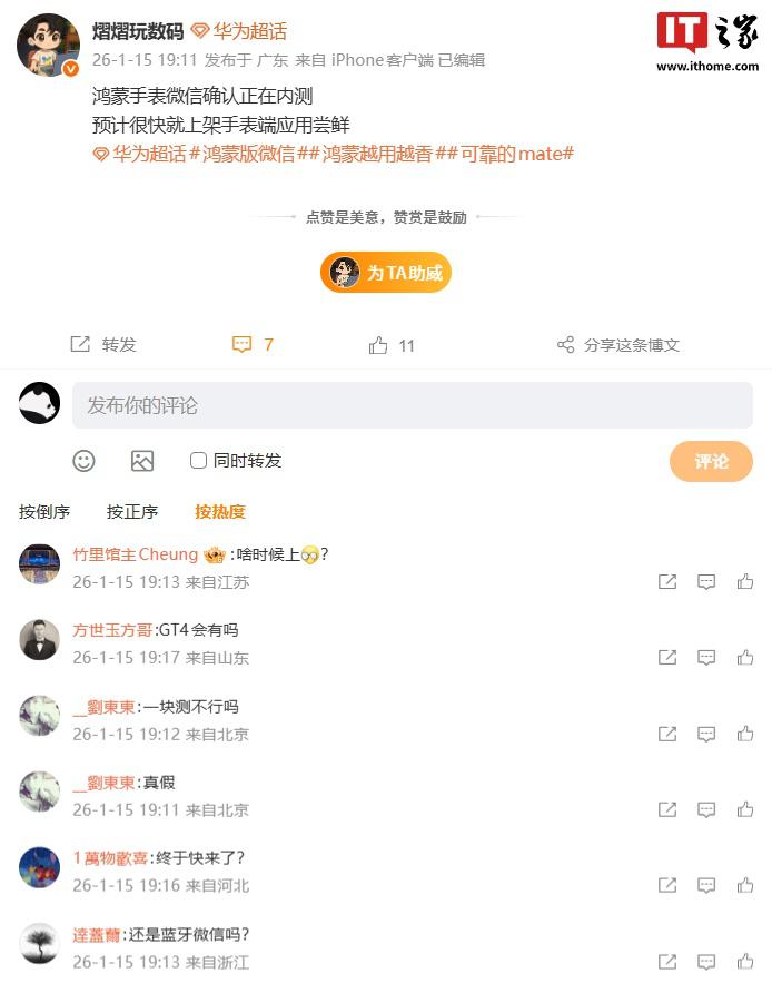 IT之家 1 月 15 日消息,博主 @熠熠玩数码 今日发文透露,微信鸿蒙手表版确认正在内测,预计很快就上架手表端应用尝鲜。