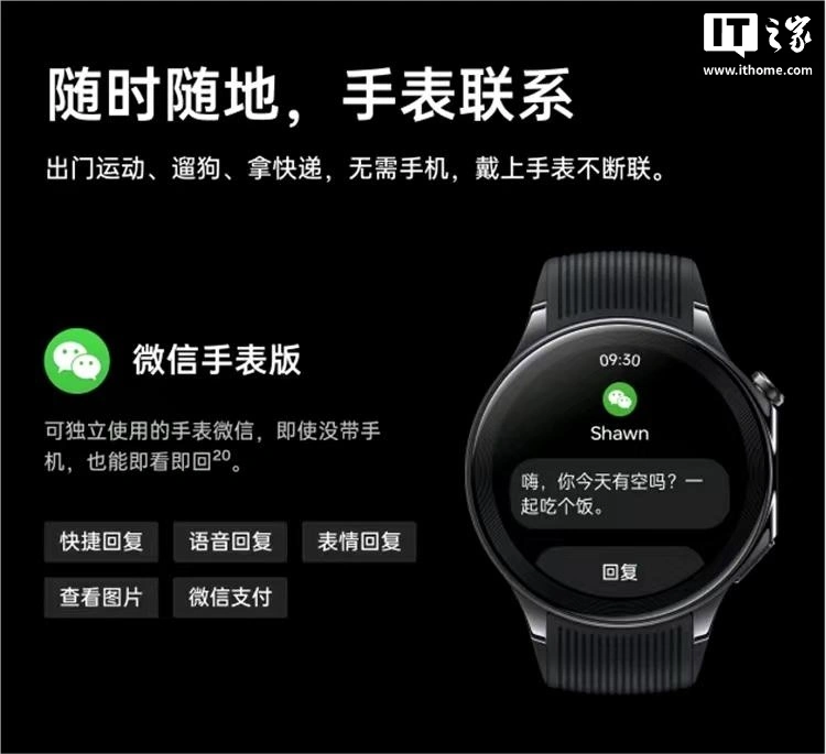 在 2024 年 3 月发布的 OPPO Watch X 带来了独立版微信,无需连接手机,即可即看即回。该版本微信也已上线小米手表 5,可发送语音、表情、快捷回复,并提供微信支付功能。此前有爆料称鸿蒙系统手表微信登录功能预计将在今年 2 月上线。